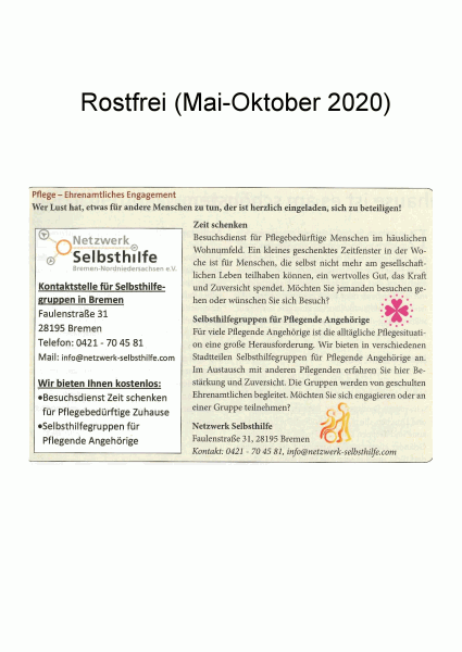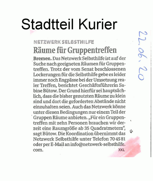 - „Selbsthilfegruppen suchen dringend Räumlichkeiten für Gruppentreffen“ , BremenNews-Redaktion (17. Juni 2020)